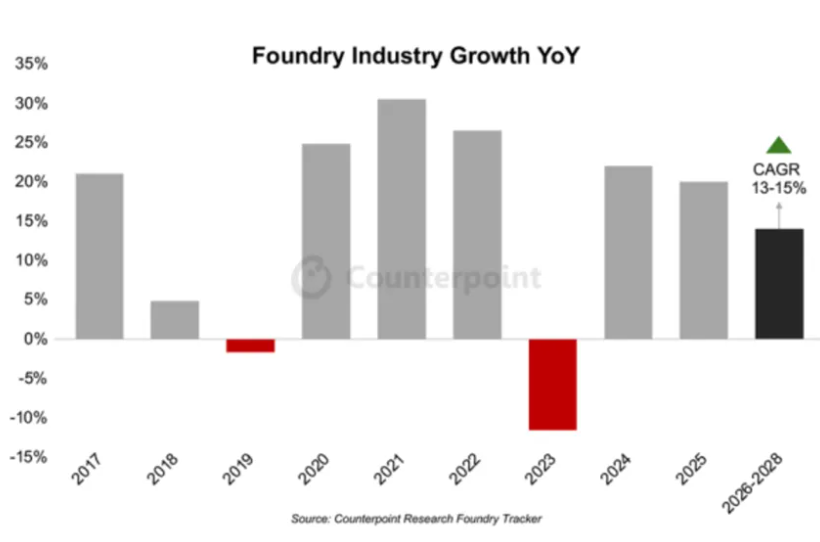 根据Counterpoint的预测,2025年之后,晶圆代工行业有望保持稳定增长,从2025年到2028年,复合年增长率将放缓至13%-15%。