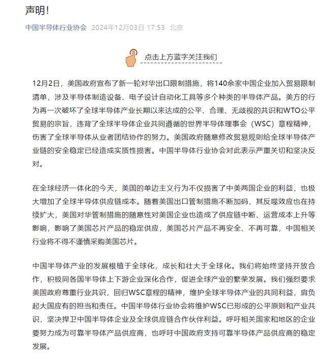 中国半导体行业协会发布声明称,12月2日,美国政府宣布了新一轮对华出口限制措施,将140余家中国企业加入贸易限制清单,涉及半导体制造设备、电子设计自动化工具等多个种类的半导体产品。美方的行为再一次破坏了全球半导体产业长期以来达成的公平、合理、无歧视的共识和WTO公平贸易的宗旨,违背了全球半导体企业共同遵循的世界半导体理事会(WSC)章程精神,伤害了全球半导体从业者团结协作的努力。