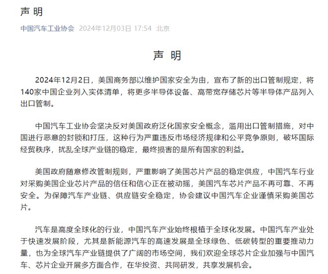 12月3日,中国汽车工业协会发布声明称,12月2日,美国商务部以维护国家安全为由,宣布了新的出口管制规定,将140家中国企业列入实体清单,将更多半导体设备、高带宽存储芯片等半导体产品列入出口管制。
