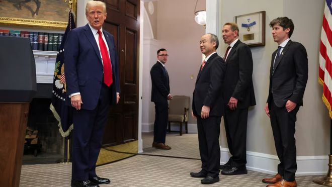 (从左至右,特朗普与软银的孙正义、甲骨文的拉里·埃里森和 OpenAI 的萨姆·奥特曼在白宫宣布成立星际之门人工智能合资企业)
