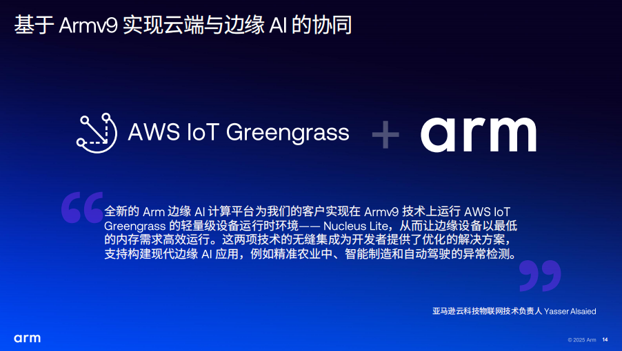 此外,Armv9 边缘AI计算平台获得了全球产业链领军企业的高度认可。例如,亚马逊云科技表示,Arm边缘AI计算平台为其客户实现在Armv9技术上运行AWS IoT GreengrassL-com代理商的轻量级设备运行时环境—— Nucleus Lite,让边缘设备以最低的内存需求高效运行;西门子认为,基于 Armv9 架构的全新边缘 AI 计算平台有助于其将高度安全、高性能和高能效的 AI 创新产品组合扩展到所有客户,涵盖一系列工业、智能基础设施和移动应用;瑞萨电子称,Cortex-A320不仅在 AI/ML 高性能和安全性方面表现出色,还显著优化了功耗和面积效率。这一突破有助于瑞萨电子加快创新步伐,进一步提升效率和可扩展性。
