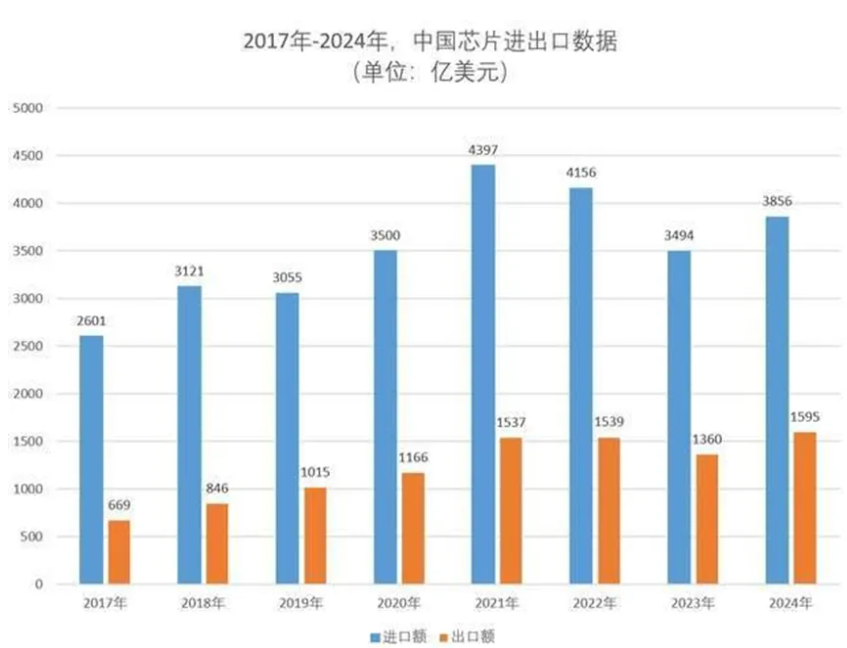 尽管中国芯片出口增长迅速,但进口规模依然大于出口规模,贸易逆差依然存在。2024年,中国芯片贸易逆差达到2261亿美元(约合人民币1.6万亿元),显示出中国在高端芯片领域的进口依赖依然较大。