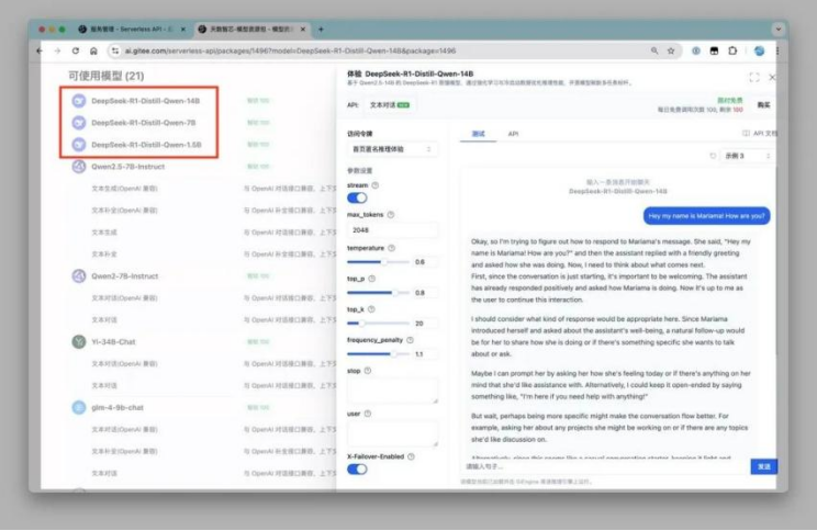 2 月 4 日,天数智芯与 Gitee AI 联合发布消息,在双方的高效协作下,仅用时一天,便成功完成了与 DeepSeek R1 的适配工作,并且已正式上线多款大模型服务,其中包括 DeepSeek R1-Distill-Qwen-1.5B、DeepSeek R1-Distill-Qwen-7B、DeepSeek R1-Distill-Qwen-14B 等。