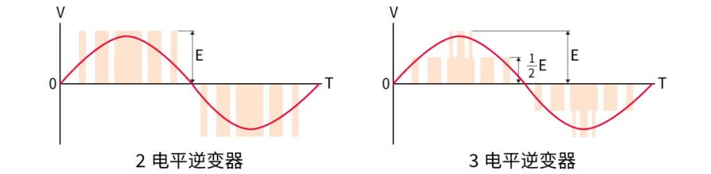由于3电平逆变器方式能够输出接近正弦波波形的逆变器,相对于2电平逆变器方式,可大幅降低转换损耗,此外,还可实现用于输出波形正弦波化的低通滤波器的小型化,因此,使交流感应马达能够减轻可造成电子设备错误操作的磁噪音和高次谐波,从而提高经济效益。