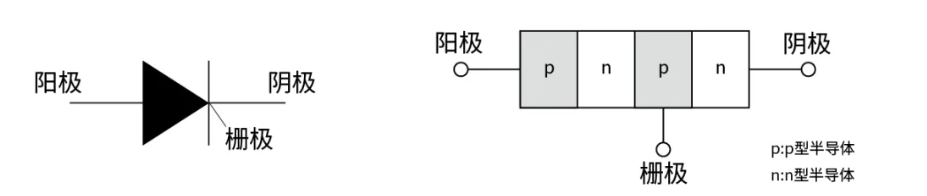 如上图所示,晶闸管是进行转换操作的半导体元件的一种。其特征是通过在栅极和阴极间施加电压并加通电流,可使阳极与阴极之间的非导通状态(关闭状态)切换为导通状态(开启状态),也就是接通(点孤)。此外,为了进行转换动作,要将开启状态切换为关闭状态及关断(消弧)状态,还需要其他的元件和电路。