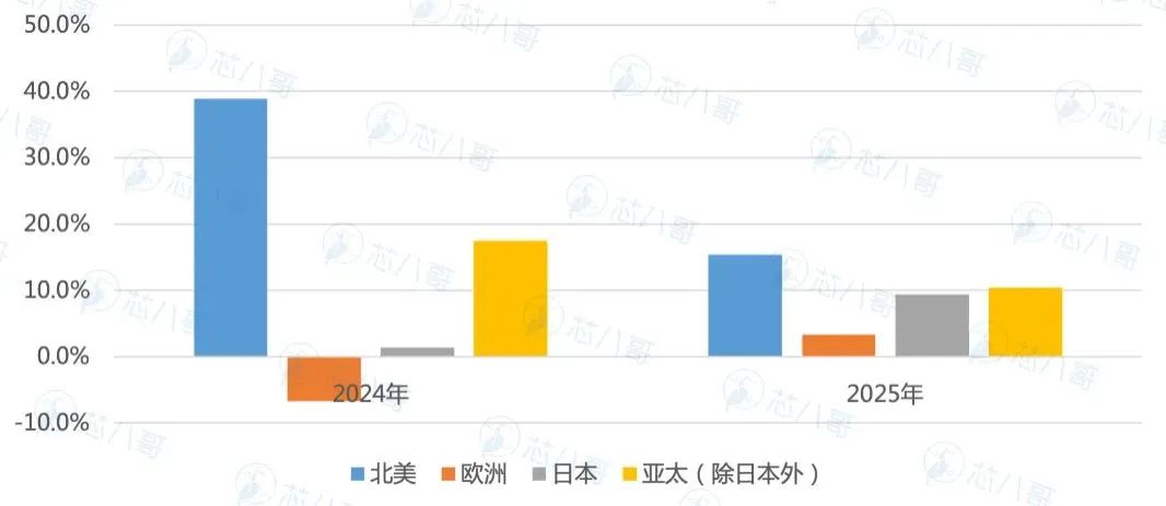 从区域市场看,WSTS数据显示,2024年以德国为代表的欧洲市场萎缩较大,同比下滑6.7%;北美和亚太市场(除日本外)增长强劲,同比增速分别达38.9%、17.5%。2025年,WSTS预测北美和亚太市场仍是最主要的增量市场,中国和美国增长预期乐观。