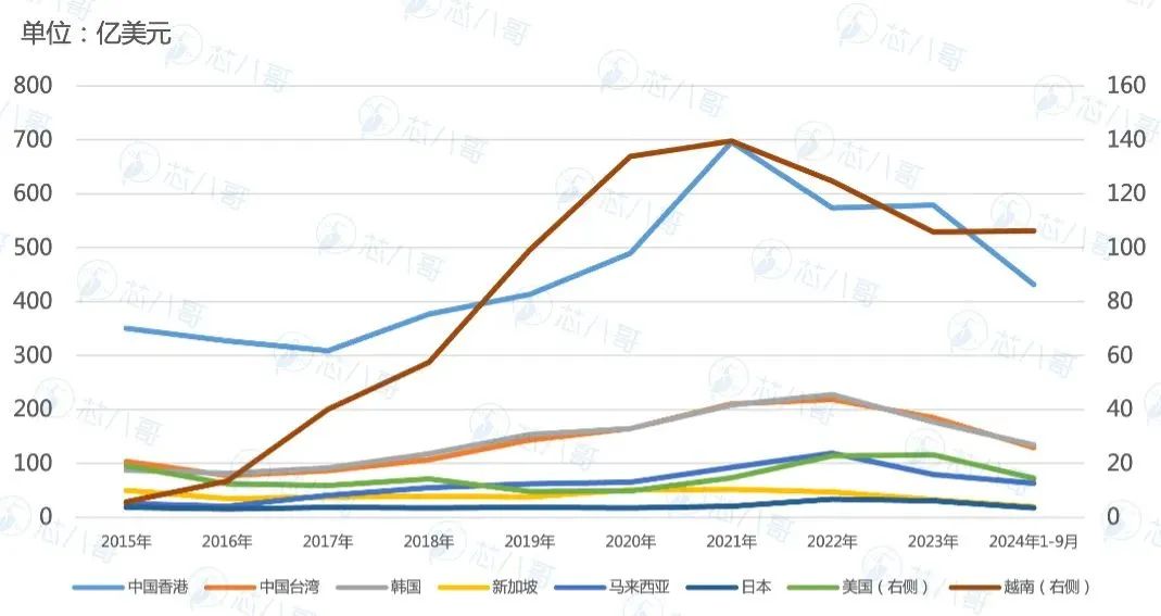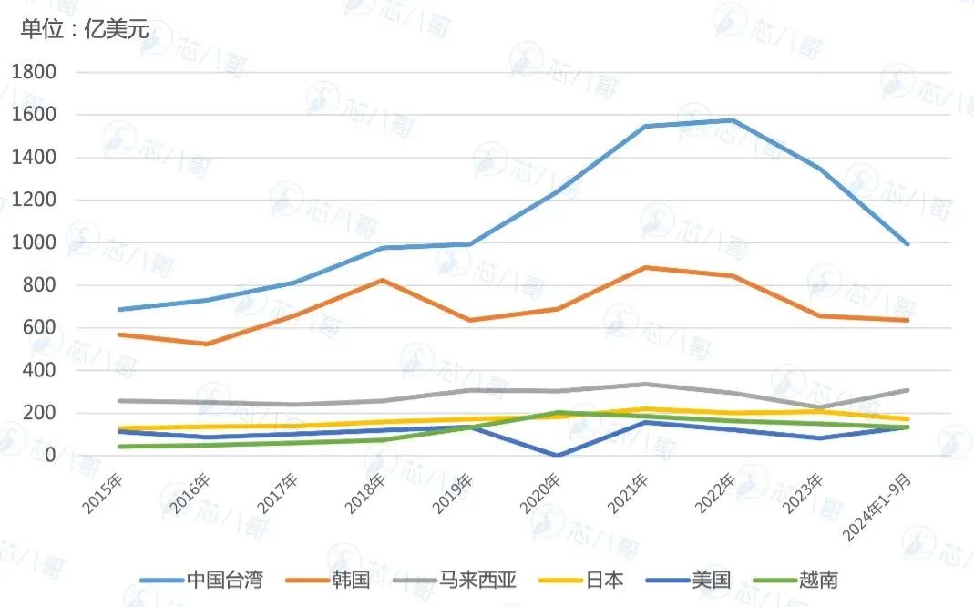 从进口市场看,得益于中国庞大的的消费电子、电动汽车、新能源及工业自动化需求市场,中国台湾、韩国、马来西亚及日本仍将是2025年中国最主要的进口来源地。其中,中国台湾自2015年以来一直是中国大陆最主要的进口来源地,2015-2022年贸易额一直呈增长状态,2023年受贸易限制影响有所下降,但仍保持第一位置。值得关注的是,随着最新对华出口政策限制升级,中国台湾地区和韩国将有一定波动。