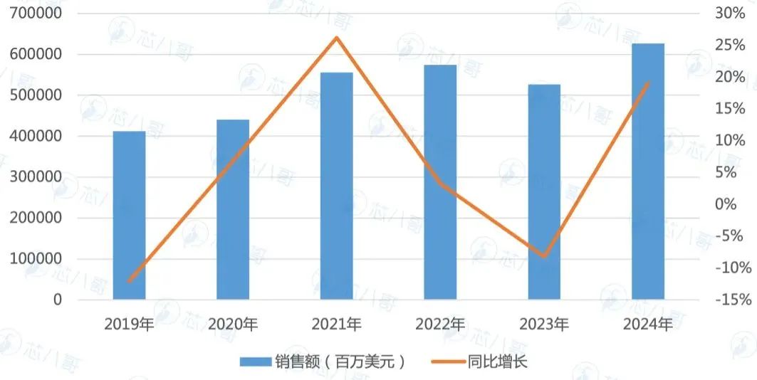 (1)全球半导体销售额强劲回升根据WSTS(全球半导体行业协会)数据,2024年全球半导体销售额约6268.7亿美元,同比增长19%。WSTS表示,全球半导体市场正式告别下行周期,步入复苏轨道。