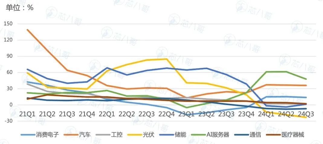 从热门应用市场头部厂商平均营收增长看,AI服务器、汽车和消费电子维持增长,光伏和通信降幅明显,工控触底回升,储能和医疗器械需求保持稳定。