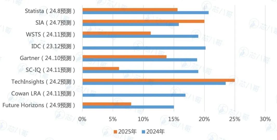 从全球半导体销售额看,2024年受中美为代表的核心市场增长推动,全球半导体行业复苏强劲,WSTS最新数据将其增速由此前的12.5%上调至19.0%。从2025年全球半导体销售额预测看,主流机构预测在6%-15.6%之间,相较于2024年放缓明显。