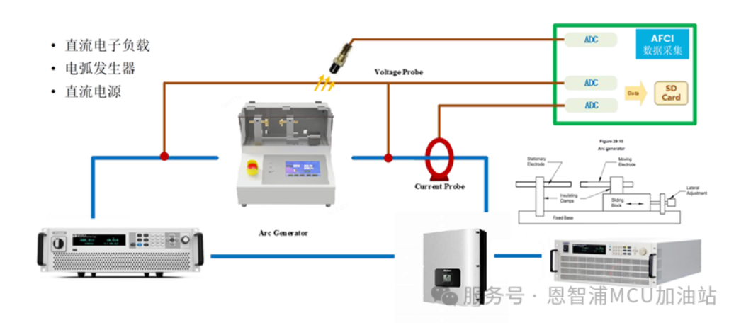 如下图所示,根据UL1699B要求搭建测试平台,PV模拟源输出经过电弧发生装置后,输入到光伏逆变器的直流PV输入端。通过串联其中的互感器,检测故障电弧产生的交流信号。通过采集板采集,MCXN947所集成的ADC,具备16bit 分辨率,同时在16bit分辨率下可支持高达2Mbps的采样速率,使其非常适合电弧信号的采集,信号通过ADC采样进入MCU进行处理。
