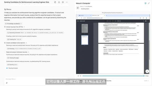 在演示中,Manus会主动解开用户上传的压缩文件。来源:Manus
