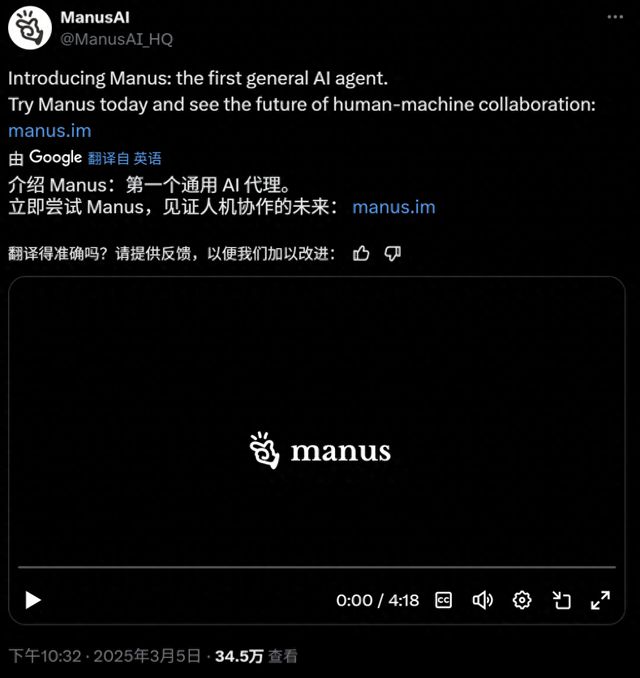 Manus被团队称为“首款通用AI智能体”。来源:X平台