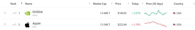 截至本周二收盘,苹果下跌3.2%,收于222.64美元。2025年以来,苹果股价累计下跌11%。周二,苹果市值被英伟达超越,痛失全球市值最大公司宝座。