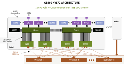 英伟达GB200 NVL72的推出引领着国内外AI网络生态对HBD技术的广泛探讨。英伟达GB200NVL72服务器是一个典型的超大HBD,实现了36组GB200(36个Grace CPU,72个B200 GPU)之间的超高带宽互联。在这个HBD系统里,第五代 NVLink是最关键的,它能够提供GPU-GPU之间双向1.8TB的传输速率,使得这个HBD系统可以作为一个大型GPU去使用,训练效率相较于H100系统提升了4倍,能效提升了25倍。