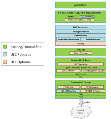 为了能够进一步发挥以太网和RDMA技术的潜能,博通、思科、Arista、微软、Meta等公司牵头成立了超以太网联盟(UEC)。如下图所示,在UEC规范1.0的预览版本中,UEC从软件API、运输层、链路层、网络安全和拥塞控制等方面对Transport Layer传输层做了全面的优化,关键功能包括FEC(前向纠错)统计、链路层重传(LLR)、多路径报文喷发、新一代拥塞控制、灵活排序、端到端遥测、交换机卸载等。根据AMD方面的数据,UEC就绪(UEC-ready)系统能够提供比传统RoCEv2系统高出5-6倍的性能。