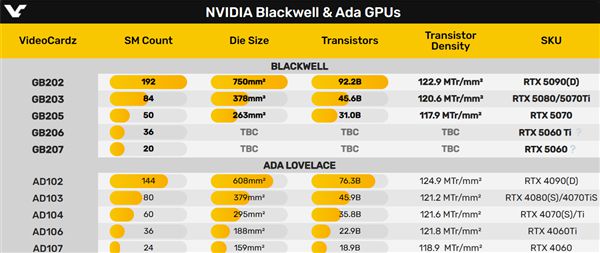 GB205(5070)的面积为263平方毫米,缩小62平方毫米,晶体管数量310亿个,减少48亿个,密度为每平方毫米1.179亿个,降低了3%。