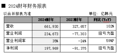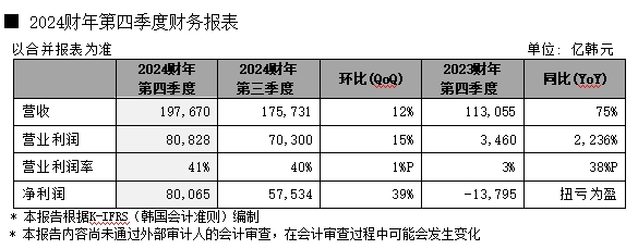 2024年第四季度的营收为19.7670万亿韩元,环比增加12%,营业利润为8.0828万亿韩元,环比增加15%,净利润为8.0065万亿韩元。2024财年第四季度营业利润率为41%,净利润率为41%。
