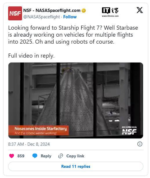 12 月 9 日消息,随着星舰第七次飞行测试的临近,SpaceX 正在加紧制造后续的火箭,为 2025 年的星舰测试计划提供支持。来自得克萨斯州博卡奇卡当地媒体拍摄的画面显示 SpaceX 正在其工厂内制造星舰上级火箭的部件,焊接机器人正在从多个角度对星舰的鼻锥进行焊接。