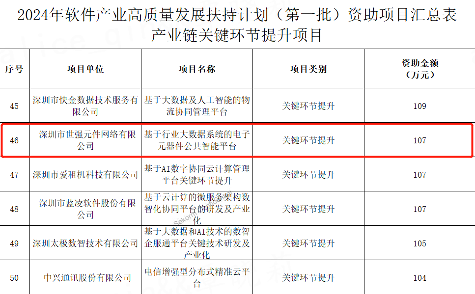 此次资助评选通过率低于15%,申报门槛和评选难度颇高,需经过专业的项目受理、专家评审、专项审计等流程。深圳市世强元件网络有限公司(以下简称“世强元件”)凭借其打造的基于行业大数据系统的电子元器件公共智能平台世强硬创,在众企业中脱颖而出,成功入选关键环节提升项目并获予107万元资助。