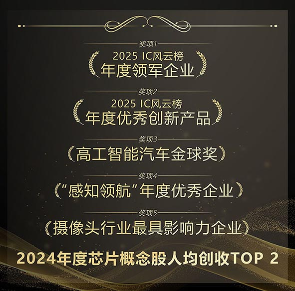 思特威(上海)电子科技股份有限公司近日宣布,接连揽获2025 IC风云榜“年度领军企业奖”和高工智能汽车金球奖“年度技术突破奖”等多个行业重磅奖项。在2025 IC风云榜同期公布的“2024年度行业榜单 · 芯片概念股人均创收(TTM)TOP 100”榜单中,思特威以排名第二的成绩领跑芯片设计行业。此外,思特威还收获了2025 IC风云榜“年度优秀创新产品奖”、第四届感知领航优秀项目“年度优秀企业奖”、“2024摄像头行业年度最具影响力企业奖”等多项荣誉,充分证明了思特威坚实的行业领先地位和卓越的市场影响力。