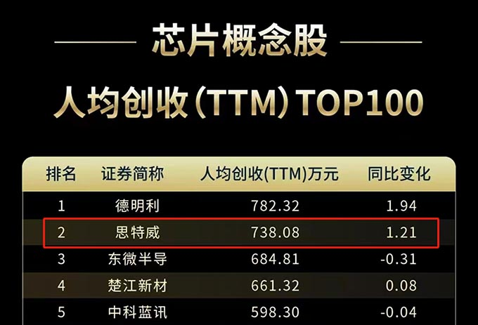 此外,思特威在“2024年度行业榜单 · 芯片概念股人均创收(TTM)TOP 100”的榜单中位列第二。该排名体现了思特威在技术研发、市场拓展等方面的卓越表现,彰显了其高效的经营能力。