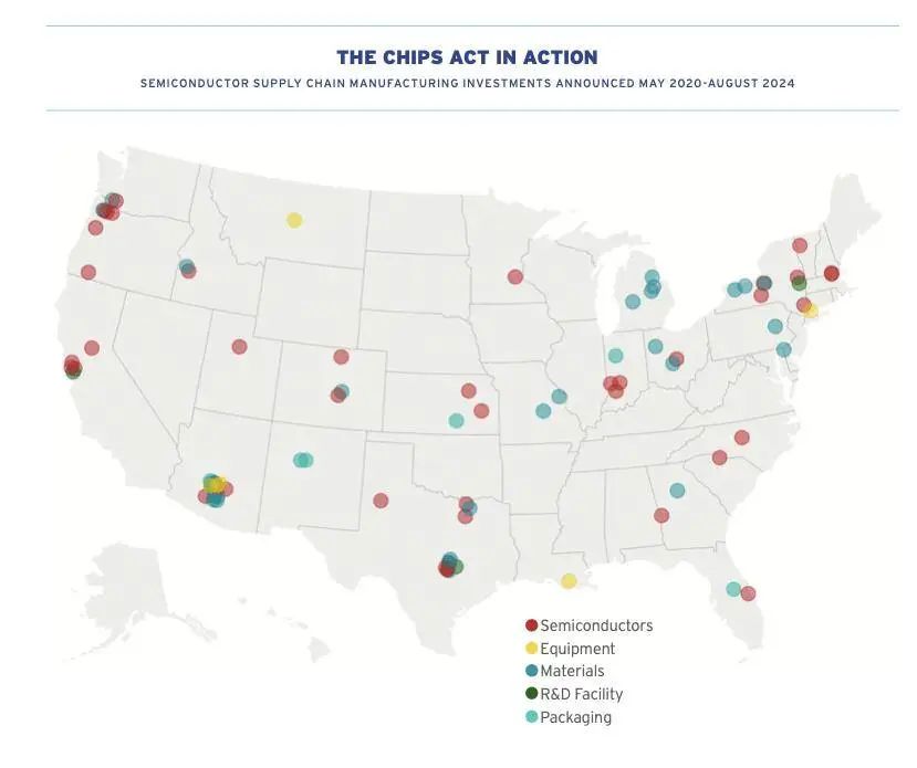与《芯片法案》相关,美国2020年5月-2024年8月半导体制造和供应商宣布的投资项目地域分布