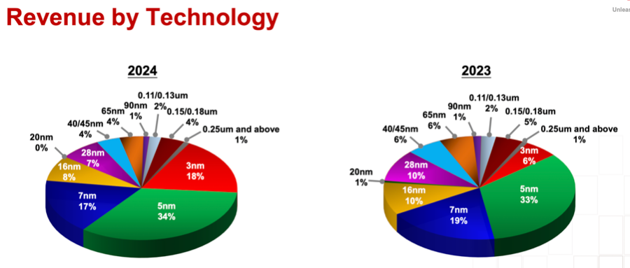 在技术节点方面,第四季度,先进制程技术(为7nm及以下)占晶圆总收入的74%,其中,3nm出货量占晶圆总收入的26%、5nm占34%、7nm占14%。2024年全年,3nm贡献达到晶圆总收入的18%,而5nm和7nm工艺技术分别贡献了34%和17%。先进制程技术占总收入的69%,高于2023年的58%。