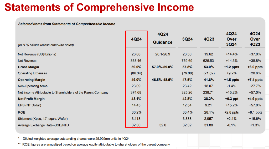 在第四季度财报会议上,台积电预计2025年第一季度营收环比会有下滑在250亿到258亿美元之间。即便台积电管理层预计一季度的营收环比将会下滑,但同比仍会大幅增加,他们在去年一季度营收188.7亿美元。今年一季度的营收如果达到预期,同比增长率就将超过30%。
