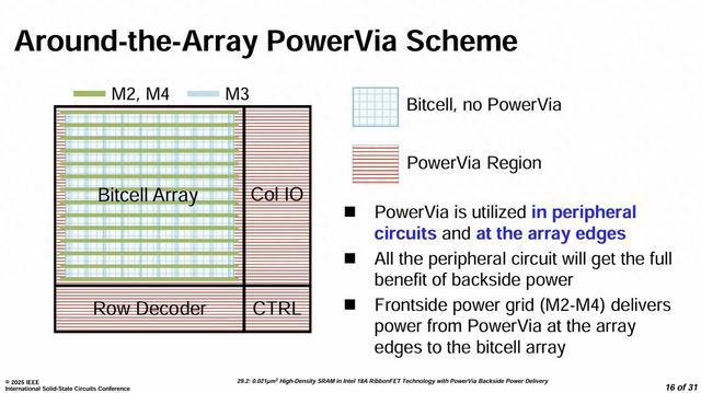实施 PowerVia 技术是英特尔解决处理器逻辑区域电压下降和干扰的首选方法。英特尔采用“环绕阵列”方案,战略性地将 PowerVias 应用于 I/O、控制和解码器元件,同时优化了无正面电源的位单元设计。