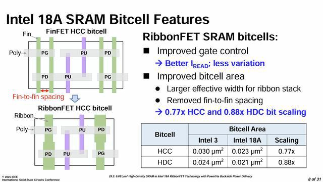 该公司展示了其高性能 SRAM 单元的坚实进展,实现了从英特尔 3 的 0.03 μm2 减小到英特尔 18A 的 0.023 μm2。高密度单元也显示出类似的改进,缩小到 0.021 μm2。这些进步分别代表了 0.77 和 0.88 的缩放因子,这是 SRAM 技术的重大成就,曾被认为是通过缩放优势实现的。