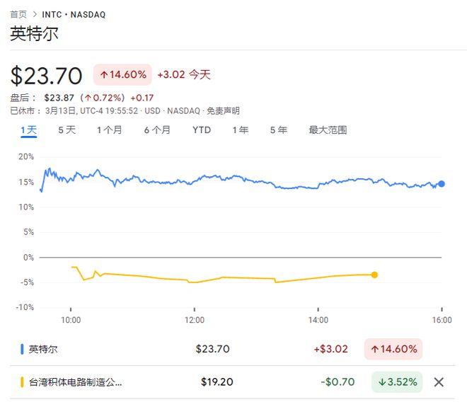 周四,英特尔股价逆市大涨近15%,收于23.7美元,在标普500指数成分股中领涨;台积电则下跌逾3%。