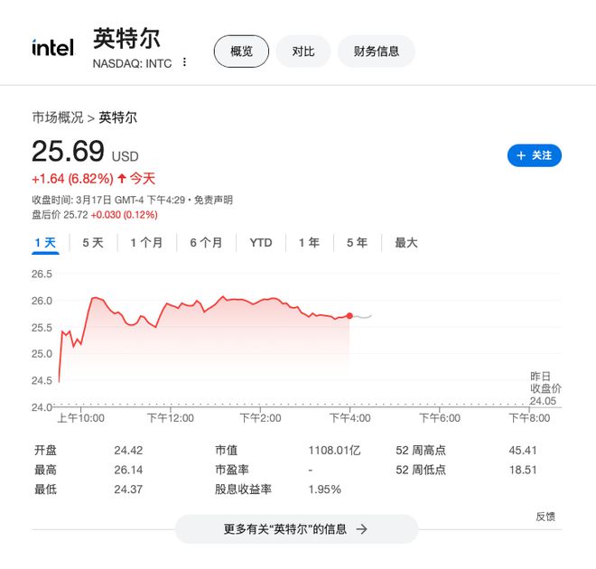 受此消息推动,英特尔股价周一收涨超过6.8%,报25.69美元。